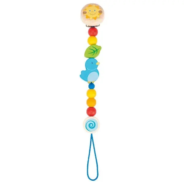 No matter where you go, this small bird will always be with you and takes care that you won't lose your pacifier. HEIMESS soft colours: For the sake of the children and the environment we use only water-based paints for our high-quality toys and dispense with clear varnish containing solvents. This may result in traces of usage due to mechanical friction. The glazing of the beads leaves the fine structure of the wood visible.