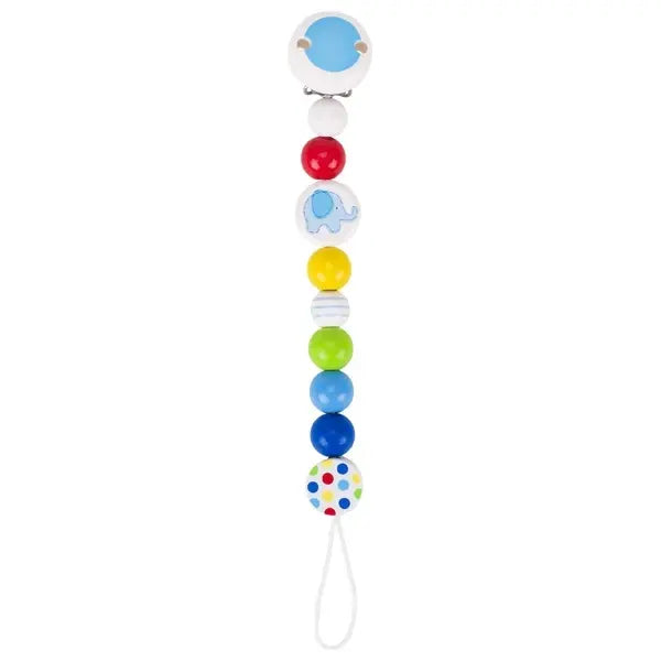 HEIMESS soother chain with safety clip and patented soother attachment, fits all currently available soothers. Harmoniously coordinated with the "pink elephant" coloured wooden beads. Naturally: Made in Germany.