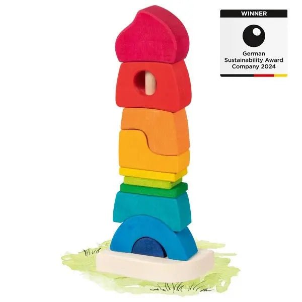 Our stacking castle opens up new possibilities for stacking and sorting. The differently shaped building blocks can be stacked on the wooden rod, but they are also suitable for free play. It is up to each child how they interact with the stacking castle.